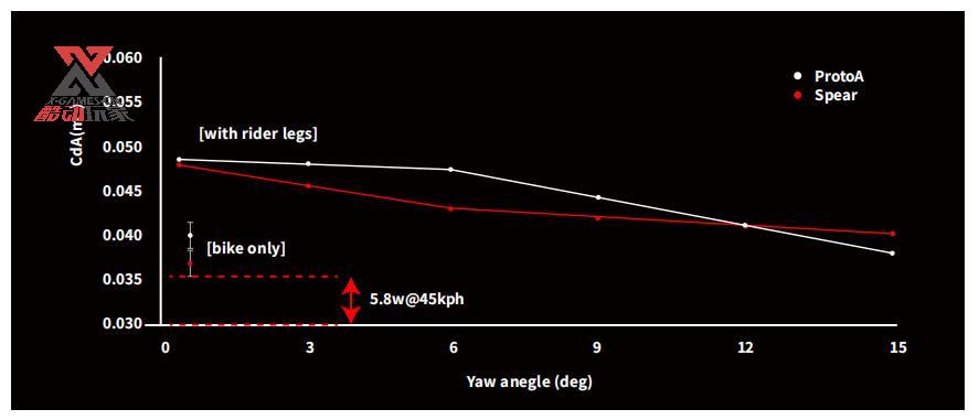 在车手骑行(动态)测试结果显示,通过cfd模拟踩踏优化的管型开始发挥作用。0度偏航角时,Spear RDC略微领先于Tarmac SL8,两者表现极为接近 。但到了骑行最常见的情况5-10度偏航角时,Spear RDC 的空气力学优势逐渐变大。 现实情况中,车手和自行车同步,车手踩踏过程中产生的湍流在经过立管后将会与转动的后轮接触,进一步产生更加混乱的湍流,从而导致空气阻力的增加。也因为SPEAR 新设计的“风眼”结构,使得SPEAR在测试中在空气动力学性能上表现的更加优异。