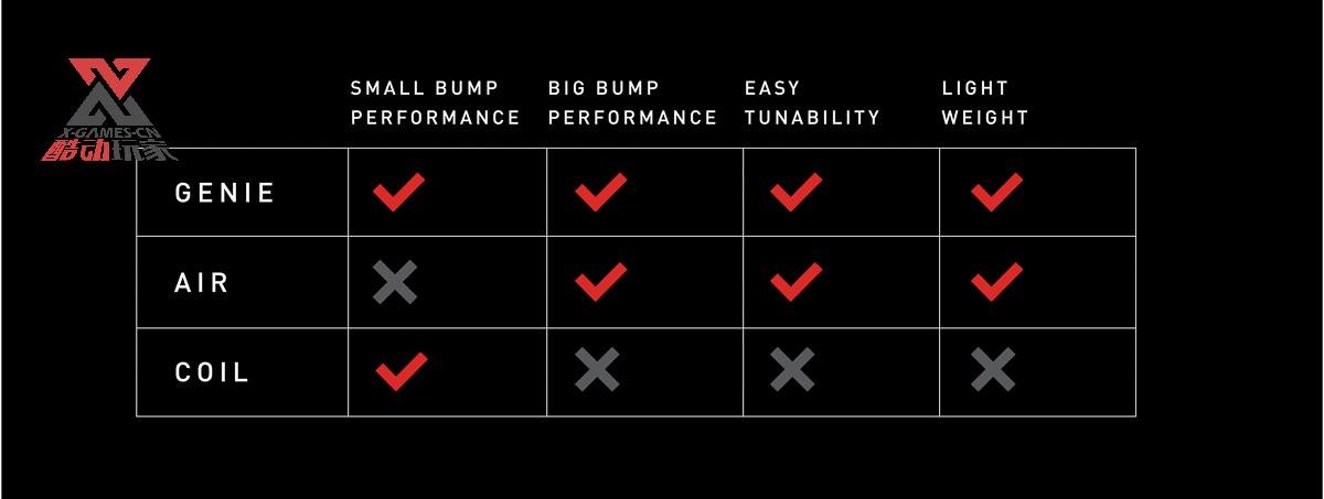 图表横栏:轻微颠簸性能、强烈颠簸性能、轻松可调、轻量化。图表纵栏:GENIE、空气弹簧、线圈弹簧。