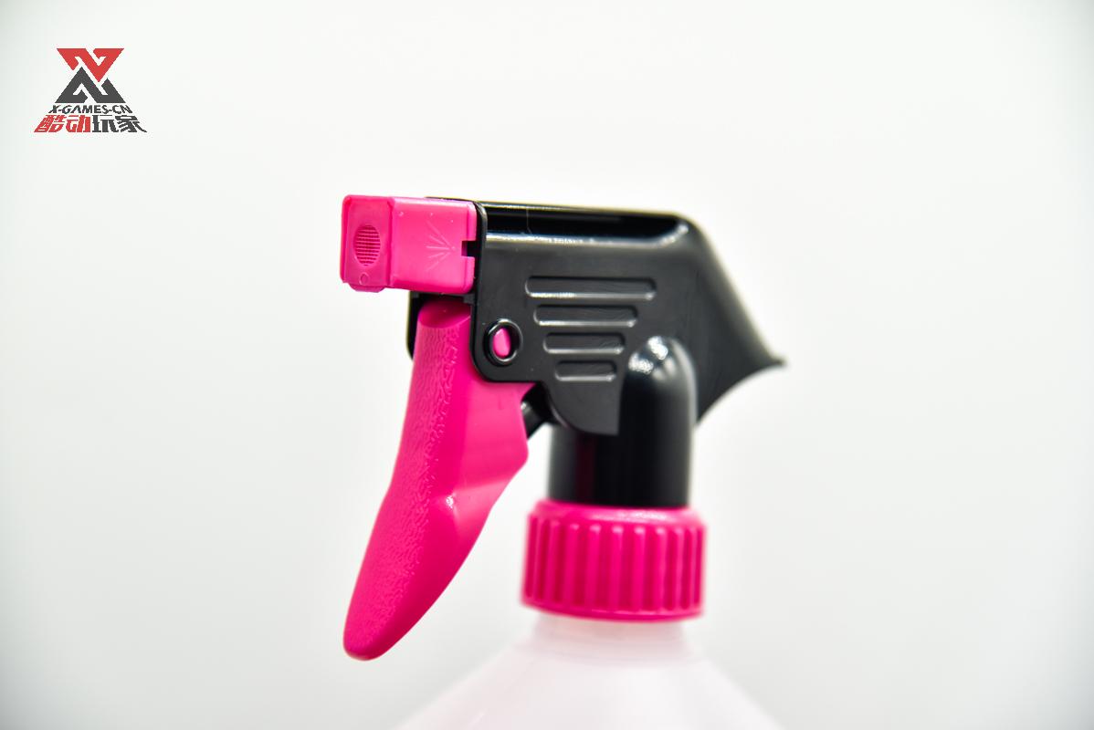 一升装的Muc-Off小粉水会自带一个可调节喷雾大小的板机喷头,用完了可以购买袋装的进行补充,土豪随意买。旋转上面的喷嘴可以调节喷雾大小,对爱车各部位进行精确喷洒,比如链条飞轮等细小零件,可以将喷嘴调至小角度喷射,车架,轮组等大面积部件可以把喷嘴调至广角雾化模式。