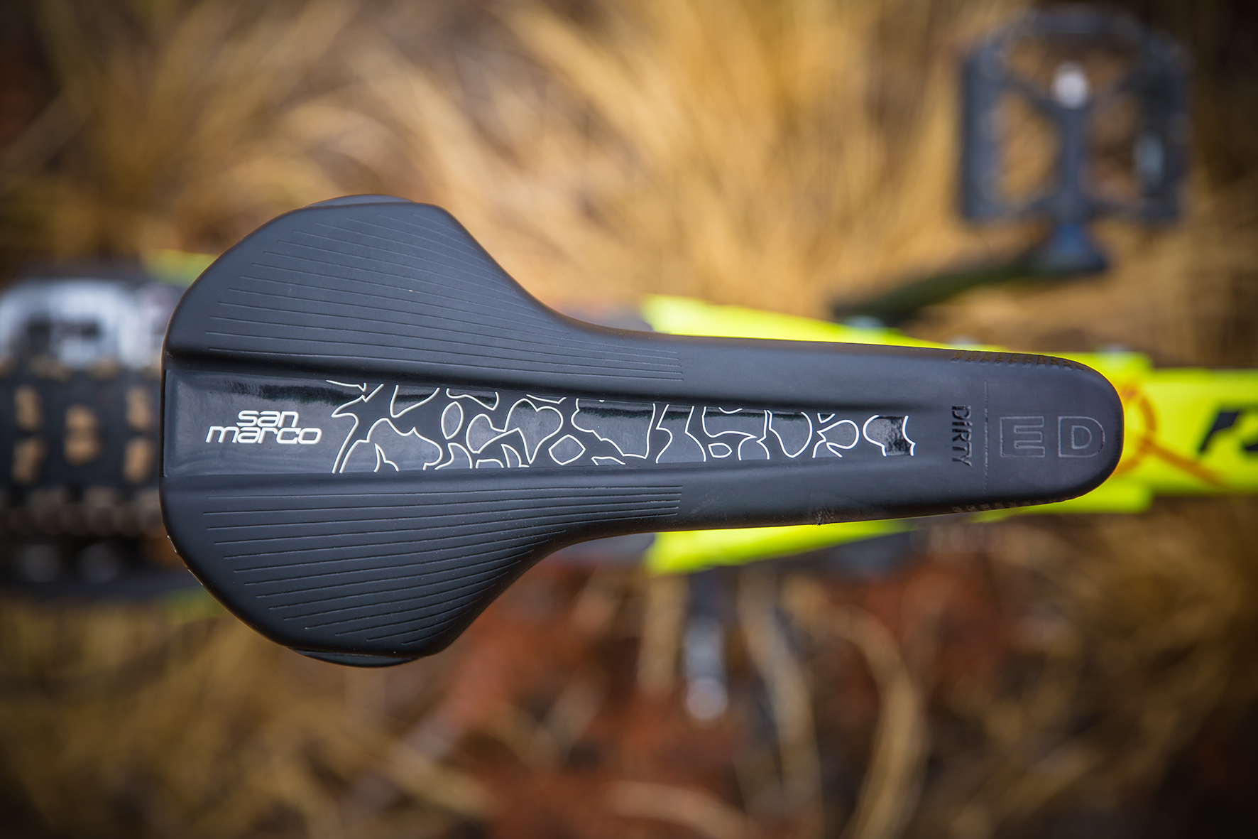 San Marco的Dirty车座分为两个系列,分别是ED和TR,ED适用于Enduro车型,TR适用与XC车型。我们此次进行评测的是ED系列有三个版本,分别是碳纤维座轨的Carbon FX;Xsilite座轨(硅含量很高的一种材料,并且含有钛和碳的粒子)的Racing;锰材质座轨的Dynamic。在我们手中的这款是Dynamic,也是Dirty系列中最便宜的一款,官方售价79欧元。