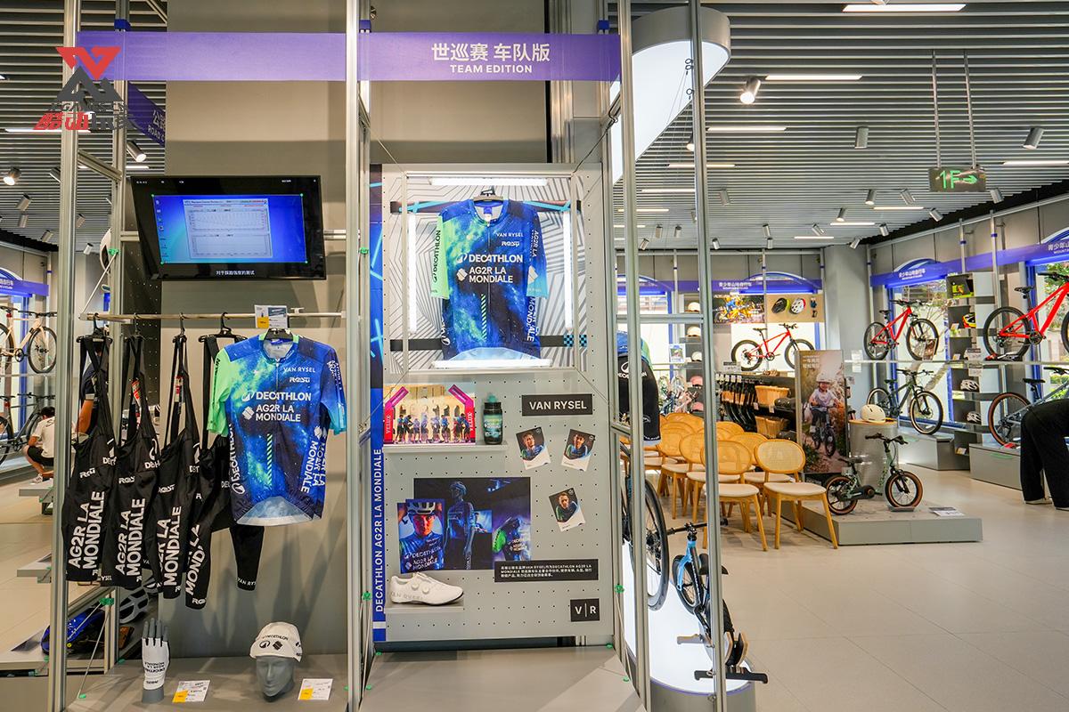 我们很清楚迪卡侬拥有丰富的自有品牌产品阵线,并根据运动类别的不同,分为20种不同名称品牌,涉及众多运动领域,对于初学者和专业运动者,迪卡侬都能提供运动服饰、装备以及各种创意类运动产品,其全产业链掌控的模式让其产品具有较高的性价比。当我们走进现在这家迪卡侬自行车专卖店时,就能发现迪卡侬花了非常多的细节设计了整个产品系列的导购路线。进门右侧已经介绍过都是儿童和青少年全系产品,大门的左侧就是全系列的山地车产品,从硬尾XC山地到林道AM山地车,都有丰富的选择。在往里面走,就是不同类型和价位的公路车产品,甚至迪卡侬非常给力的设置了迪卡侬的专属世巡职业车队产品展示区。
