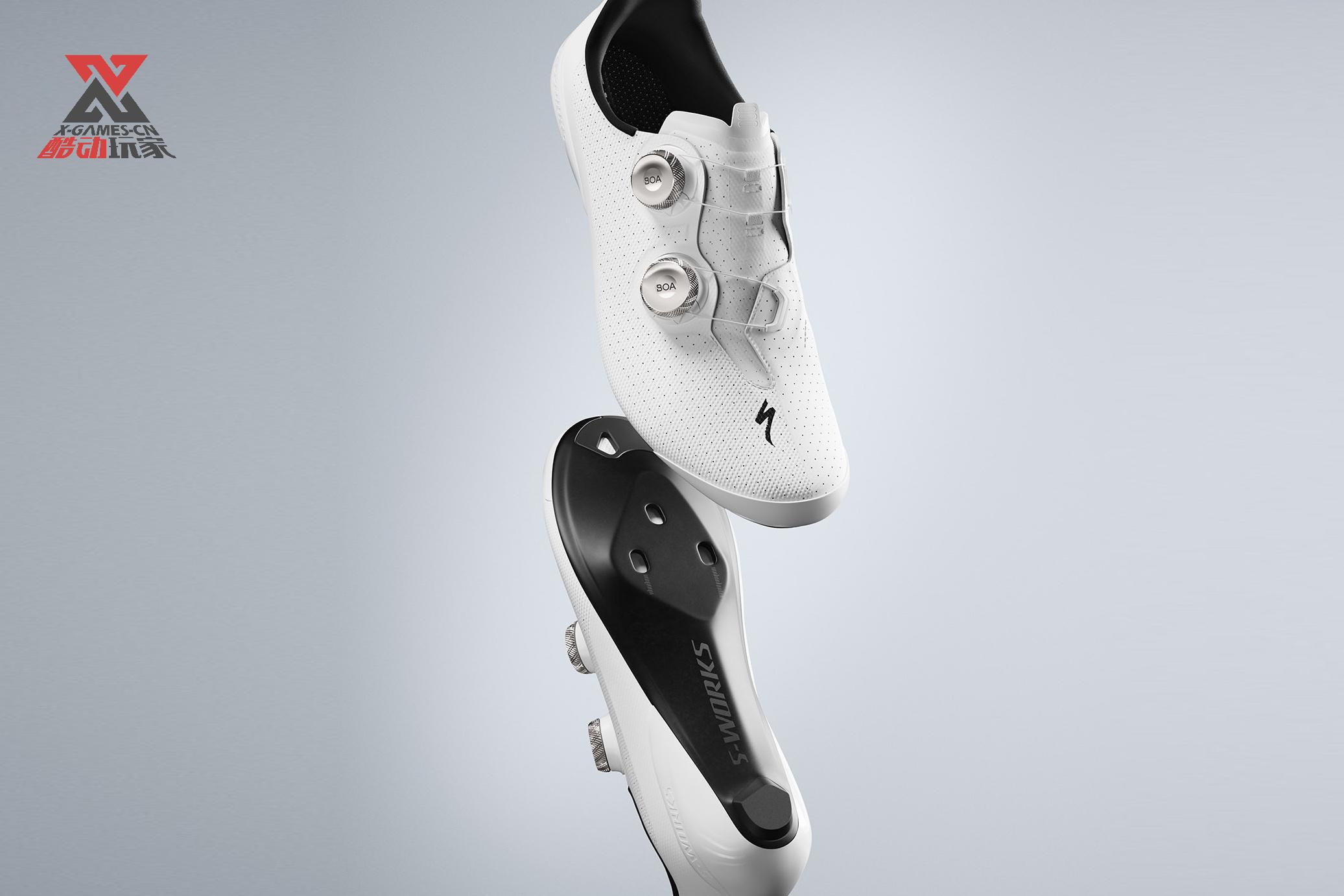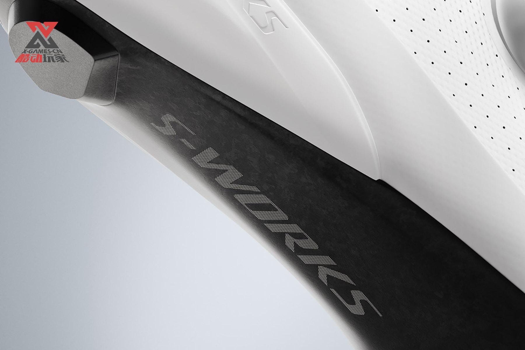 另外一个新的变化就是S-Works Torch的鞋面,重新布置了S3 Boa® 旋钮调节系统,将Boa® 线束下移,并呈现一定的角度,从而更好的固定前脚掌。这样的改进可以取消之前S-Works 7上魔术贴,不仅提供了增加力量的结构,还减少了没有必要的挤压。新的一些微小改变可以让车手感受到脚部与锁鞋的贴合性和性能多方面的提升。通过骑行数据研发出的分区强化带设计,也让车手在踩踏过程中可以拥有更好的力量传导的速度和效率,尤其是针对大脚趾部位的强化设计,让提升阶段得到更高的利用。