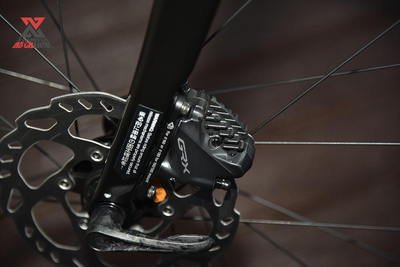 车架前后均采用12毫米桶轴结构,刹车采用GRX油碟刹车,刹车夹器带有散热片。以GRAVEl的车种用途来说,碟刹是必需品,不是选品。因为长途旅行的各种路况有的时候路面真的犹如泥地越野,一套可靠的刹车系统可以保障车手的安全。