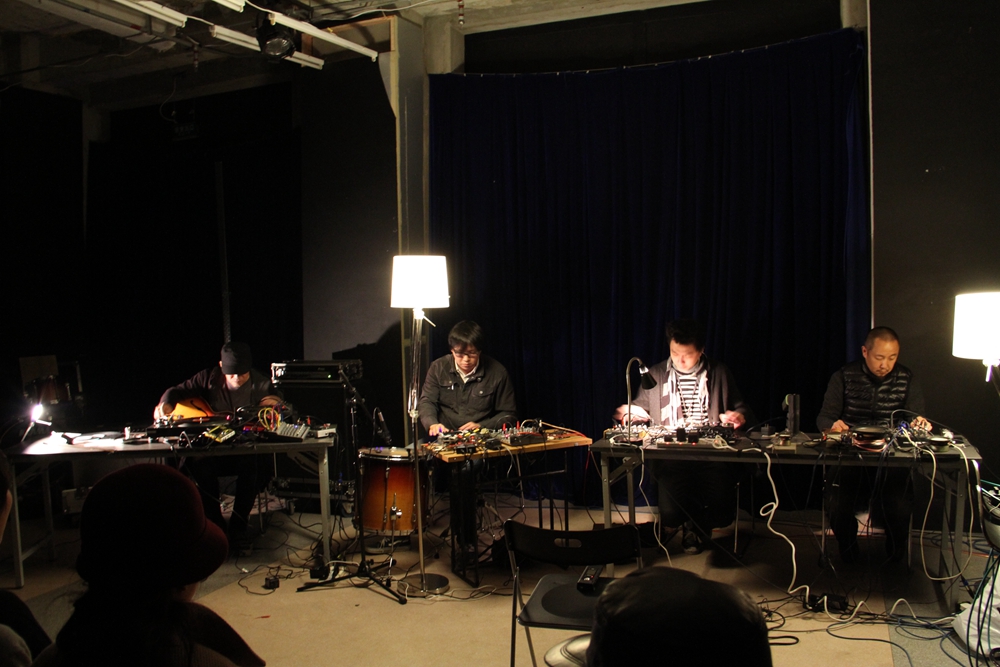 问:如果单纯从设备上来说,FEN肯定是有过很多次变形的。你还记得期间有过怎样的变化吗?我还记得2009年第一次看的时候,袁志伟使用笔记本电脑,柳汉吉使用钟表(还是打字机?反正很机械的东西),大友良英用吉他和唱盘,你是反馈,还读了诗;2013年的时候,袁志伟已经开始用KORG的小合成器了,柳汉吉用一些东西在鼓上振动,声音很大,大友也不用唱盘了,你也没读诗:)。而现在,FEN的配置是两把电吉他(大友良英和袁志伟),你使用电子设备,柳汉吉使用笔记本。目前的配置似乎已经稳定了很长时间里,这个配置又是怎么成型的?