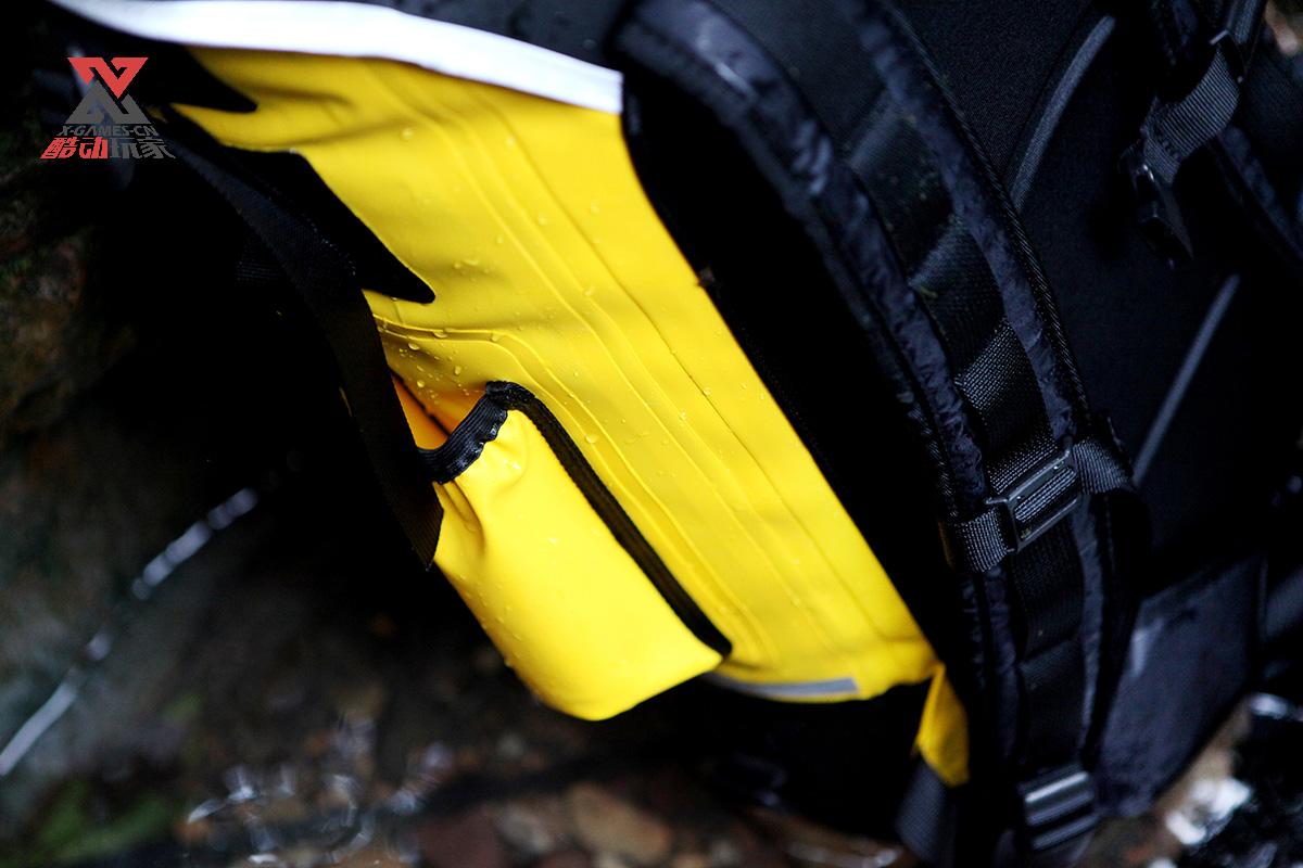 背包顶部有顶盖设计,在内部的防水拉链闭合以后可以做到覆盖。如果因为粗心导致拉链没有拉好,可以在穿越瀑布的时候防止顶部的水灌入背包内部。如果用户的拉链没有闭合好,包又完全侵入水中,这个顶盖起到的作用就是让水侵入包内的过程变长一些,让用户有补救的时间。